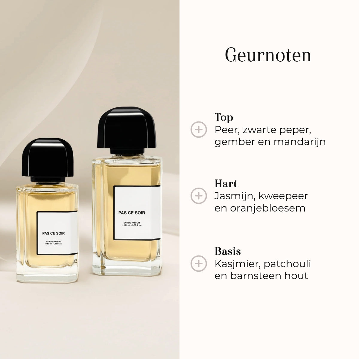 Inspiratie: Pas Ce Soir is geïnspireerd door een mysterieuze en sensuele nacht in Parijs. Voor de chique en eigenwijze dame, net opgefrist van werk en klaar voor een avond uit. Deze dame heeft klasse, charme, stijl. Of ze met jou mee naar huis gaat? Pas ce soir, niet vanavond.