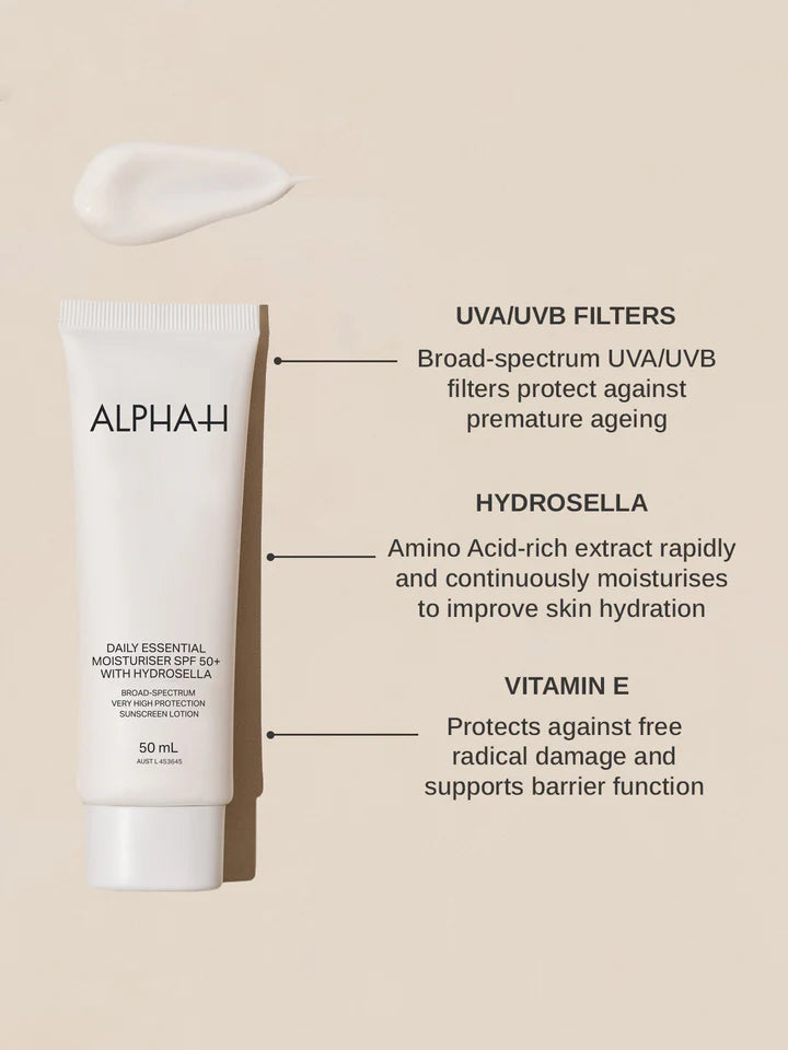 De Alpha-H Daily Essential Moisturiser SPF50+ is een hydraterende dagcrème met spf vol antioxidanten. Het voedt, hydrateert, is een fijne basis voor make-up, trekt snel in en laat geen vette of witte waas achter op de huid.