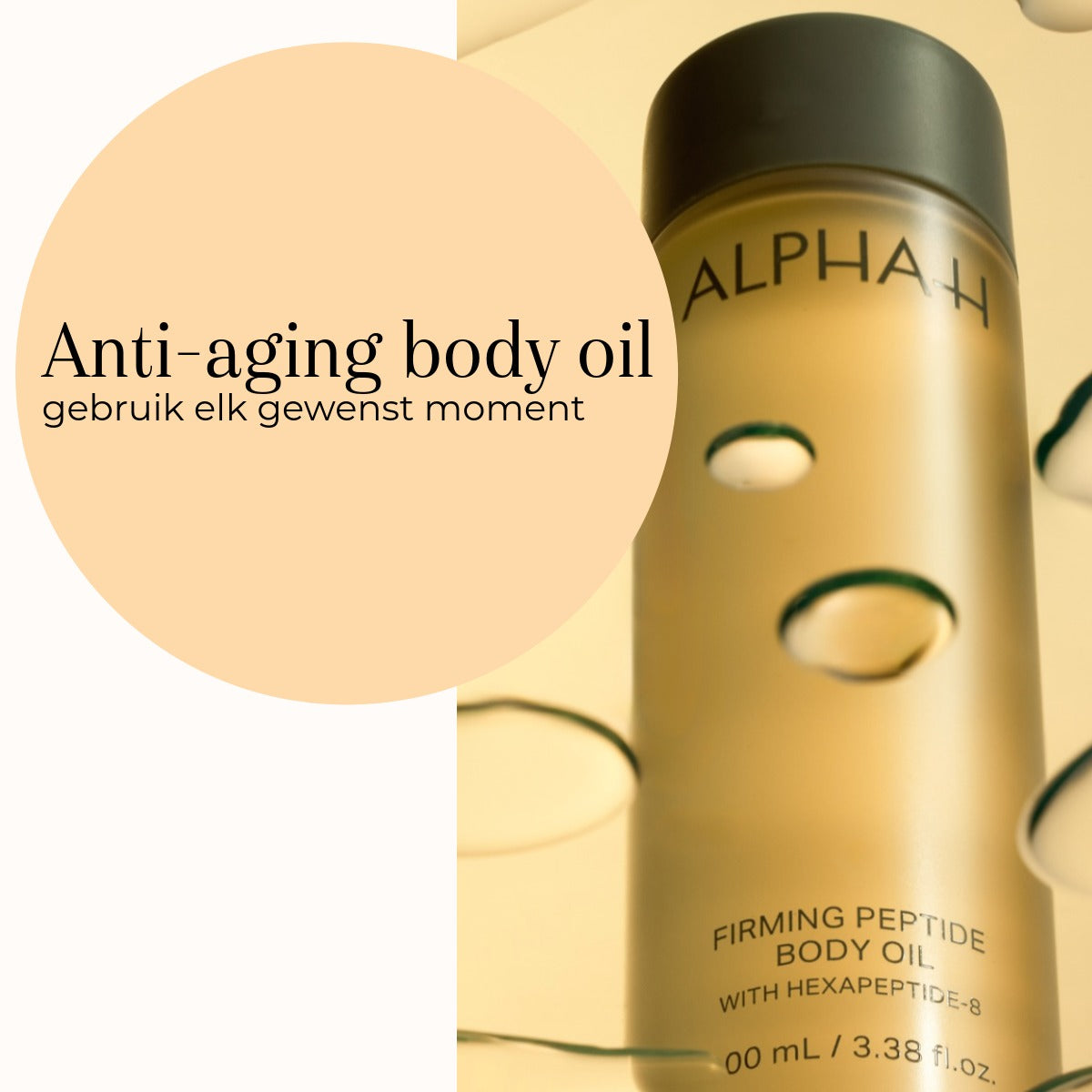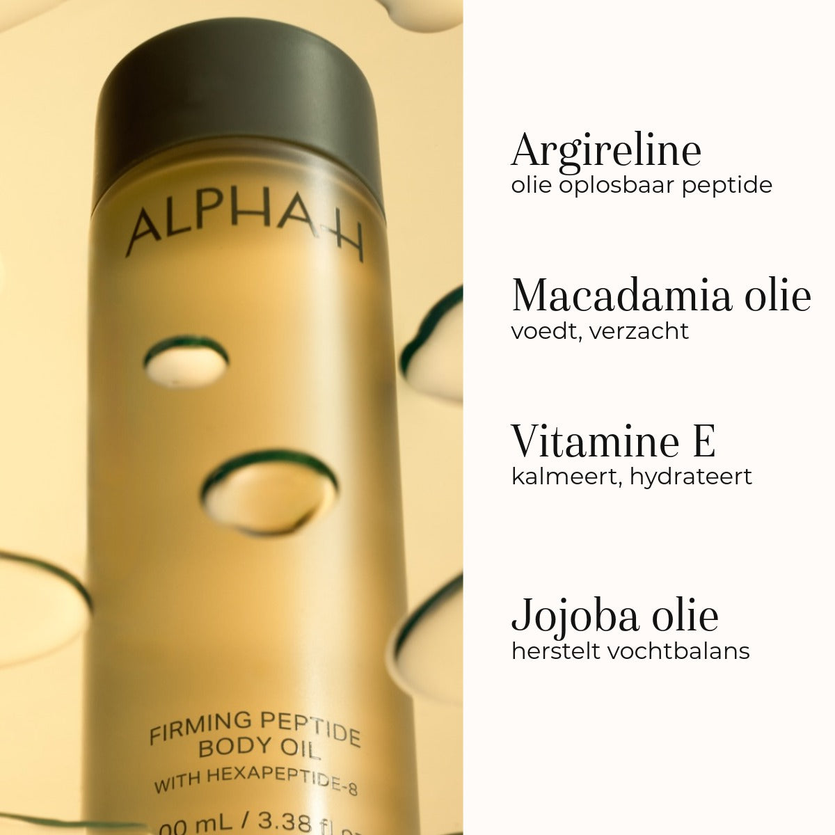 De Alpha-H Firming Peptide Body Oil is een zijdezachte, snel intrekkende droge body oil. Het verstevigt de huid en gaat tekenen van huidveroudering tegen. Met zichtbaar resultaat in vijf weken.