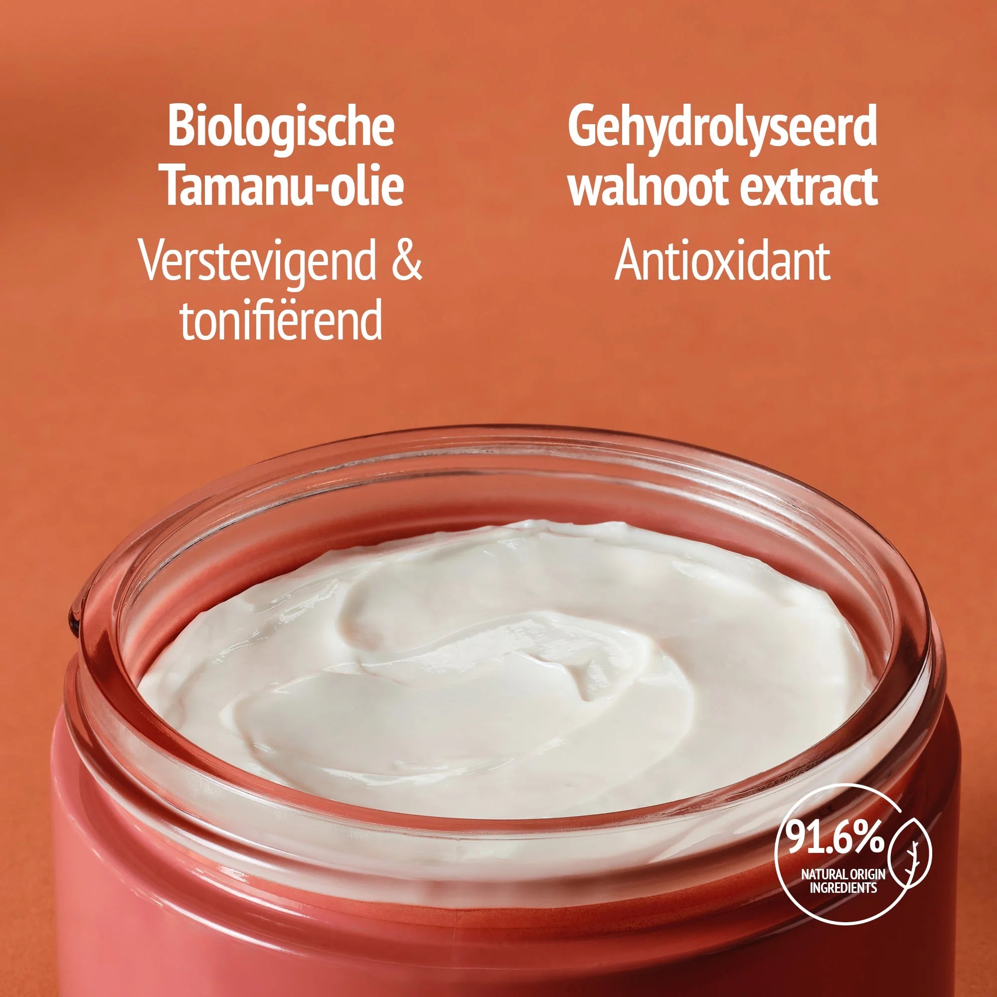- Biologische Tamanu Olie: Extract van een heilige plant uit Indonesië met een elasticerende werking voor een zachtere en gladdere huid.