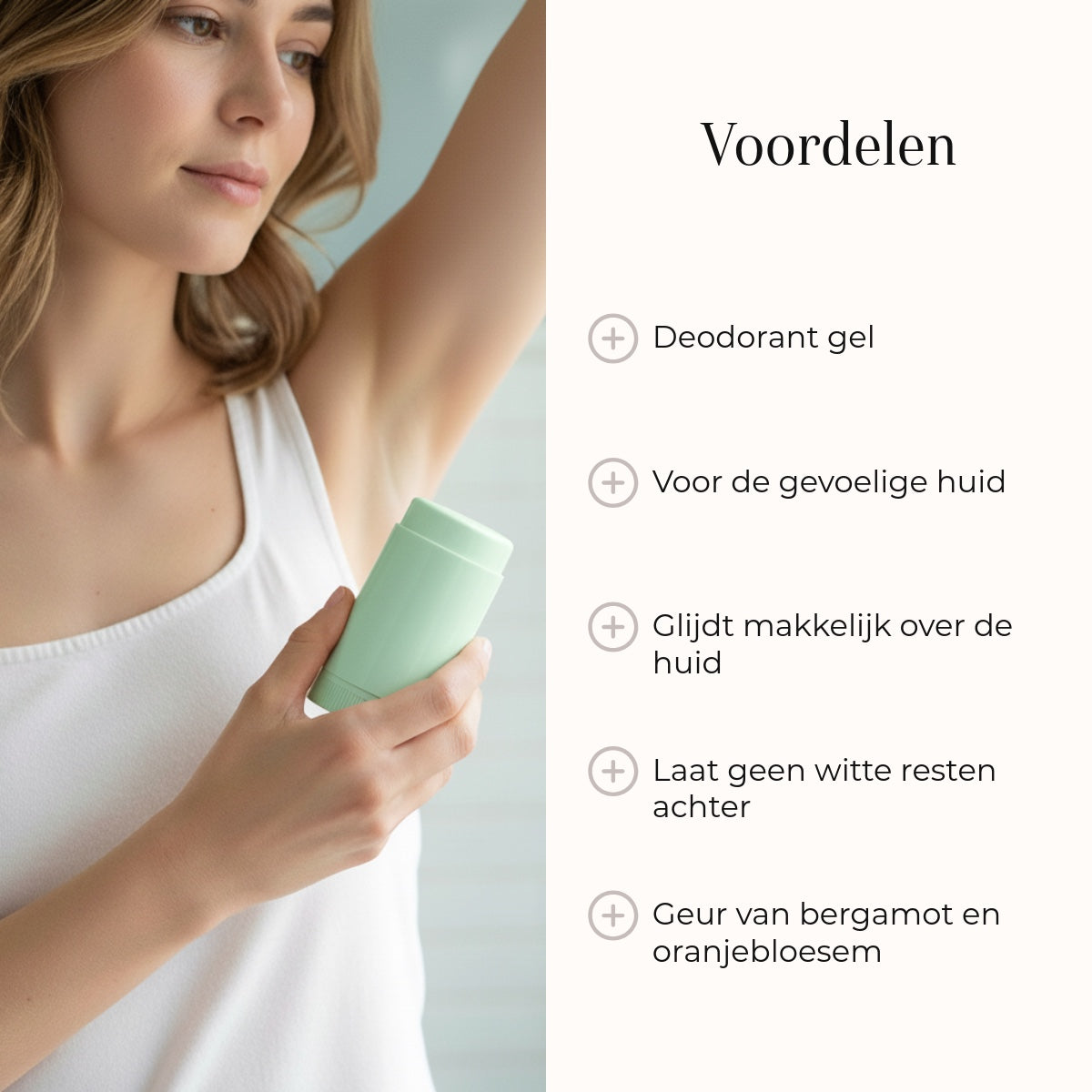 Deze deodorant bevat geen baking soda maar arrowroot powder en is daarom zeer geschikt voor de gevoelige huid. De deostick heeft de textuur van een gel, glijdt makkelijk over de huid en laat geen witte resten achter. Het heeft de geur van bergamot & oranjebloesem.