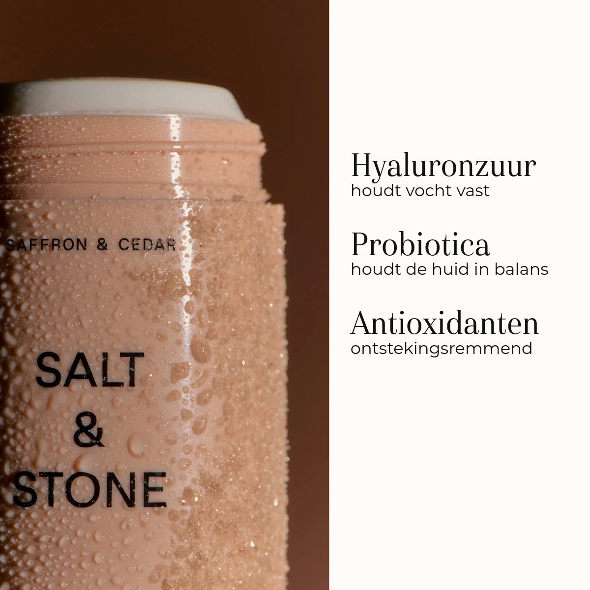 De Salt & Stone Natural Deodorant Saffron & Cedar hydrateert is verrijkt met zeewierextracten en hyaluronzuur. Zij zorgen ervoor dat de huid gehydrateerd wordt, terwijl probiotica nare geurtjes helpt te neutraliseren.