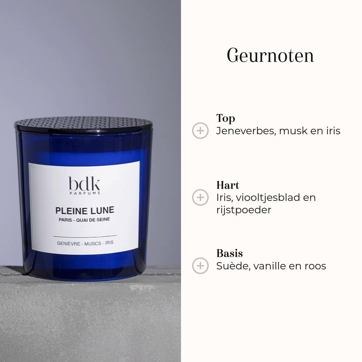 De BDK Parfums Pleine Lune is één van de vijf geurkaarsen waarmee de Parijse nachten worden gevierd. De BDK geurkaarsen representeren een stedelijke reis naar het hart van de nacht, om de straten van Parijs te ontdekken bij kaarslicht.