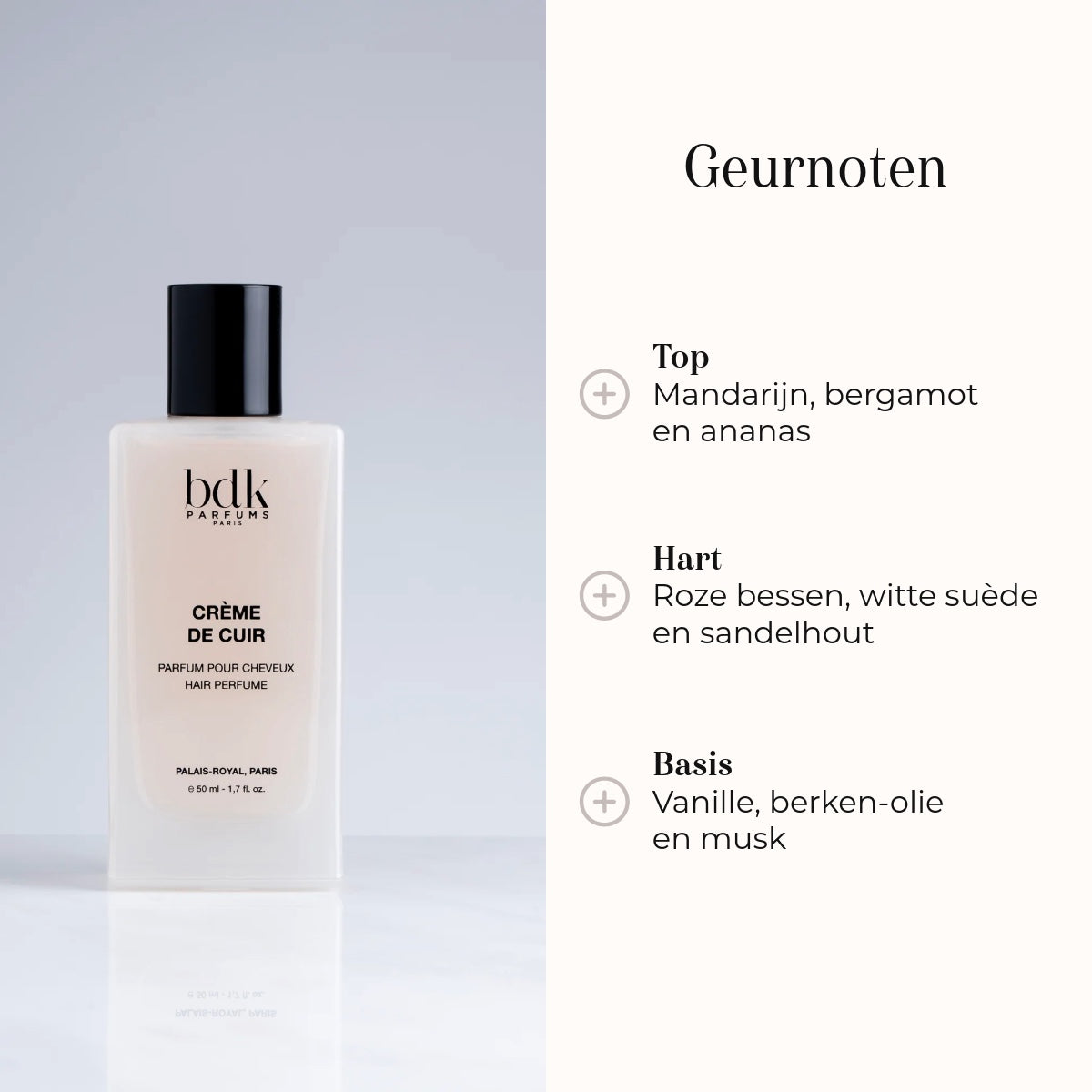 Het BDK Parfums Hair Perfume - Creme de Cuir heeft een leerachtige geur met noten van citrus, vanille en muskus. Het haarparfum bevat verzorgende ingrediënten die hydrateren, de elasticiteit verbeteren en de haren zijdezacht maken.