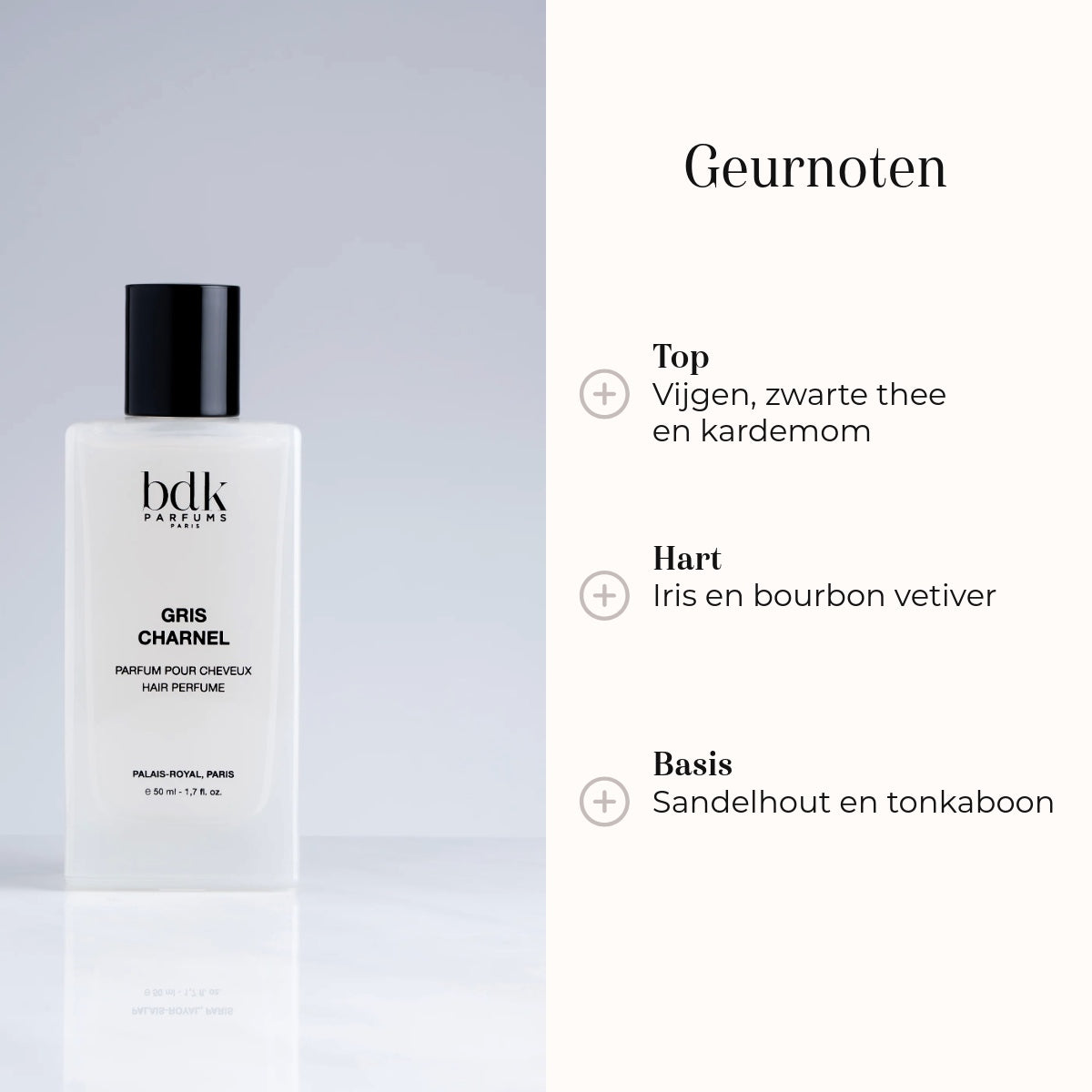 Het BDK Parfums Hair Perfume - Gris Charnel heeft een houtige, kruidige en poederige geur die is geïnspireerd door de stedelijke sensualiteit van Parijs. Het haarparfum bevat verzorgende ingrediënten die hydrateren, de elasticiteit verbeteren en de haren zijdezacht maken.