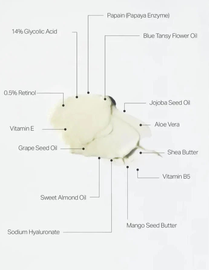 - Retinol 0.5%: Vermindert tekenen van huidveroudering, behandelt onderzuiverheden en helpt pigmentvlekjes, (acné)littekentjes, fijne lijntjes en grove poriën te vervagen. De huid wordt steviger en de teint frisser en egaler.