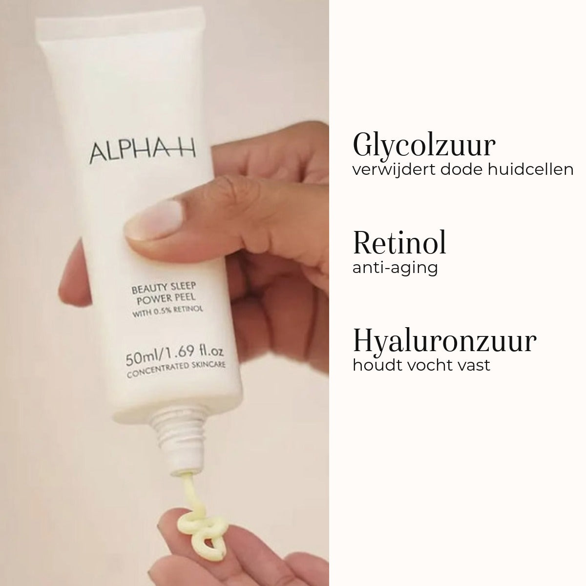 Alpha-H Beauty Sleep Power Peel is een exfoliant dat verrijkt is met glycolzuur en retinol en werkt terwijl jij slaapt. Deze overnight peeling geeft je huid een boost, het stimuleert de collageen aanmaak, vermindert fijne lijntjes, rimpels, pigmentatie, verslapping, grove poriën, zonschade en acne littekens.