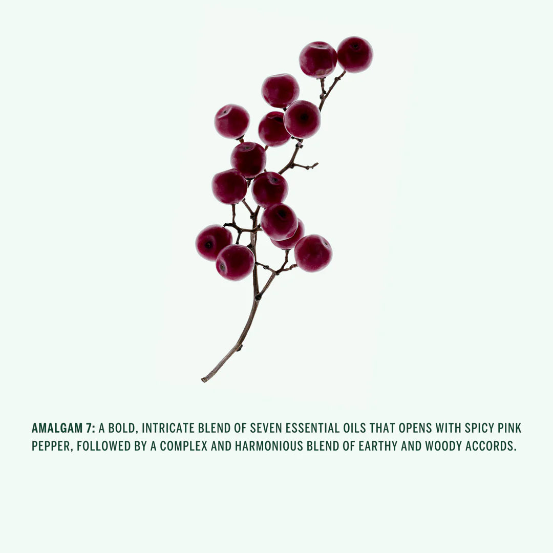 Een gedurfde en complexe geur die opent met de kruidige frisheid van roze peper, gevolgd door een rijke mix van koriander, zwarte peper en venkel, die lagen van zoete kruiden en aardse, groene tonen biedt. De geur verdiept zich vervolgens naar een rijke, houtachtige basis van ceder en patchouli, wat een uniek en harmonieus aromatisch profiel creëert.