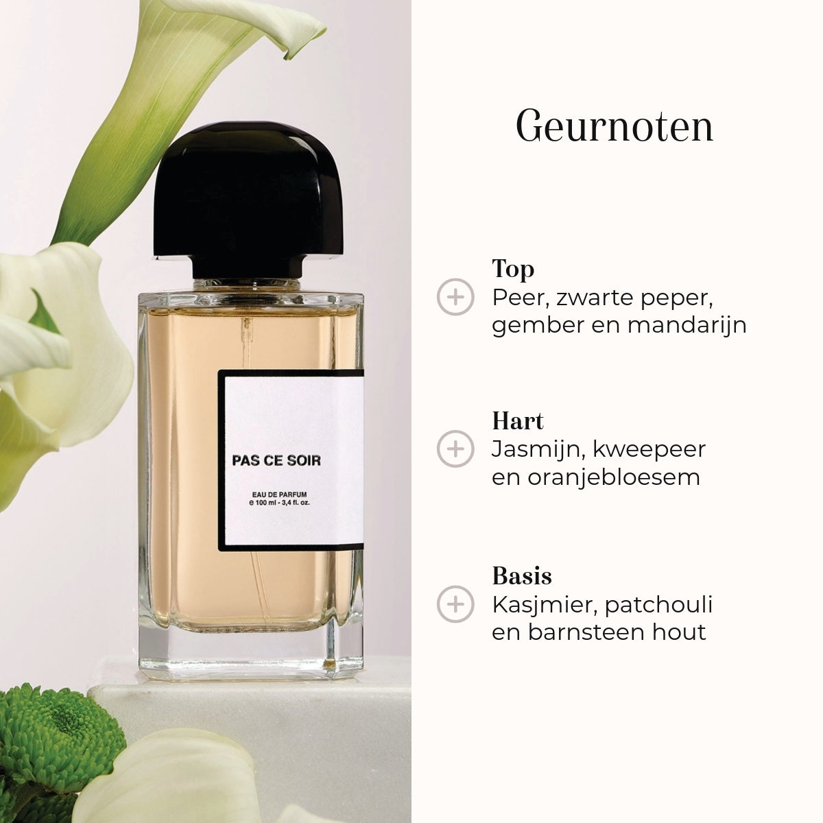 BDK Parfums Eau de Parfum - Pas Ce Soir is een milde en bloemige parfum. De geur is subtiel fruitig, kruidig en houtig waarbij jasmijn, kweepeer en oranjebloesem de boventoon voeren.