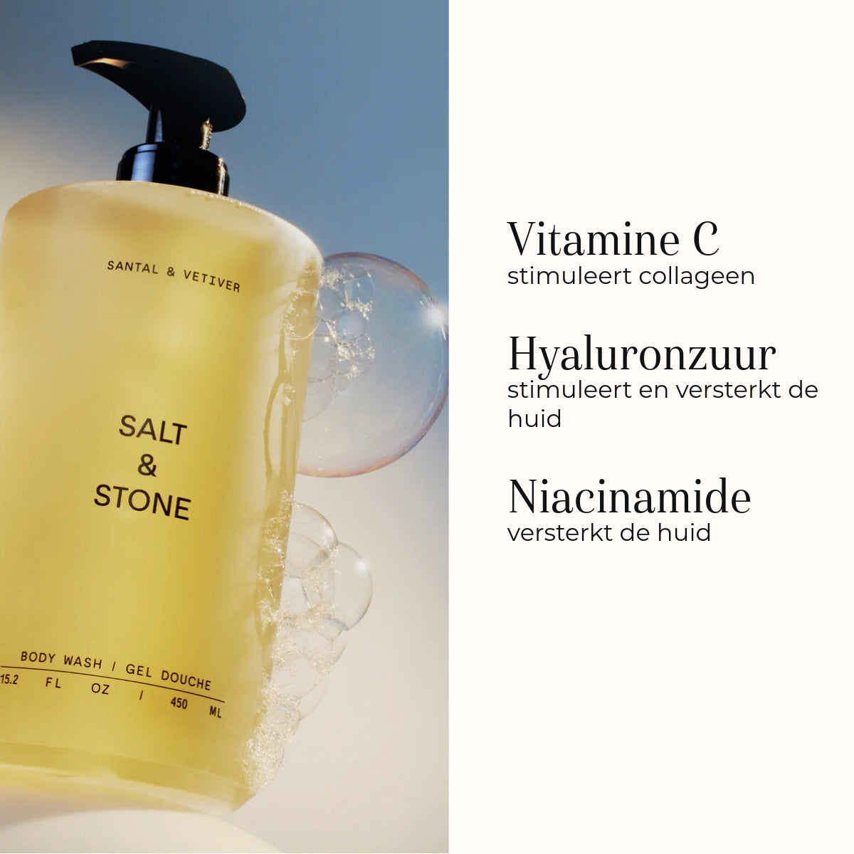 De Salt & Stone Body Wash - Santal & Vetiver is een verfrissende douche gel die gemaakt is van natuurlijke hydraterende ingrediënten. De douche gel verzacht en kalmeert je huid. Het helpt je huid te herstellen van de uitdrogende effecten van zon, zee en wind.