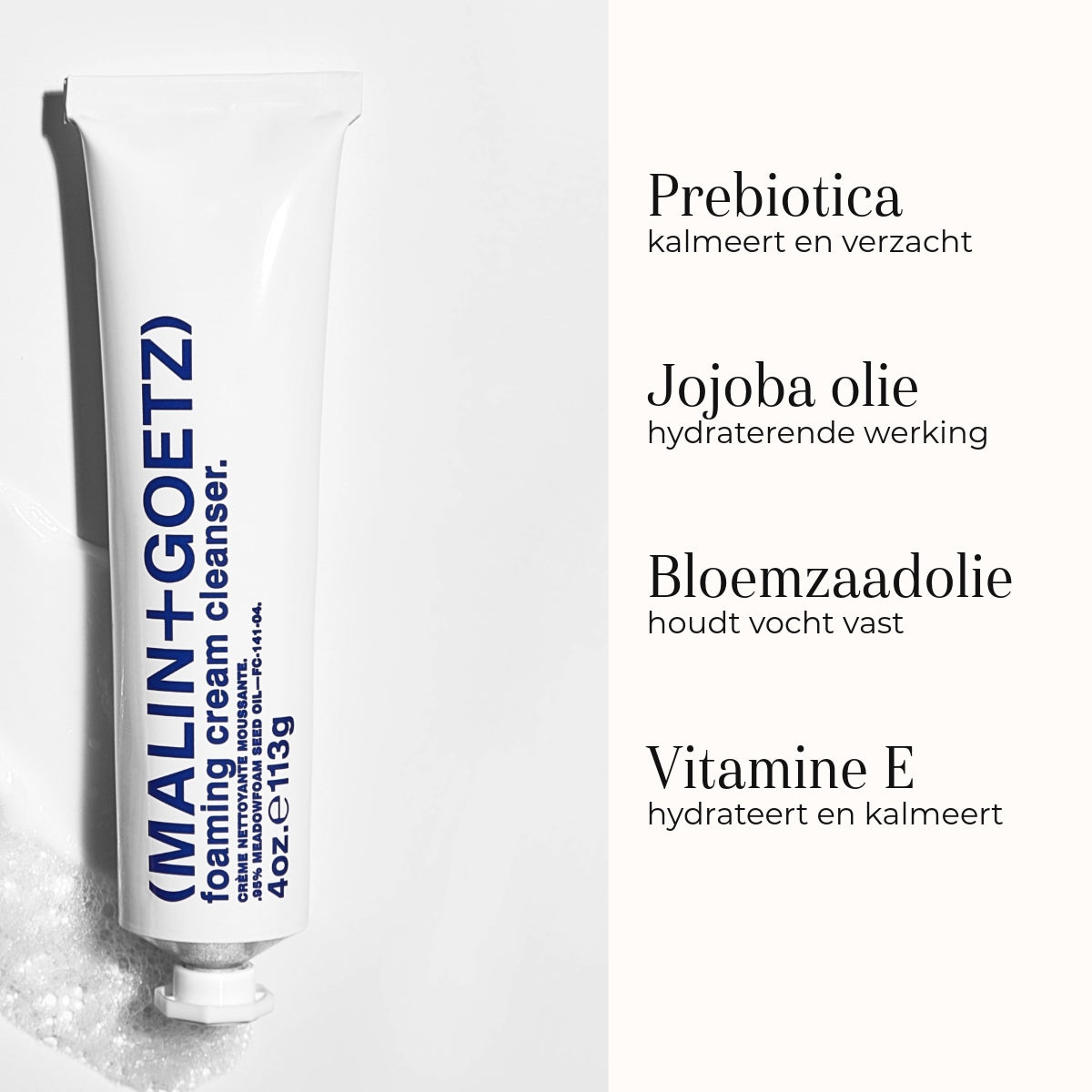 De Malin+Goetz Foaming Cream Cleanser is een diepe reinigende crème die in een reiningsfoam verandert. De pH-neutrale formule reinigt de huid zonder het te ontdoen van de natuurlijke oliën. Hierdoor voelt de huid na het reinigen soepel en comfortabel aan.