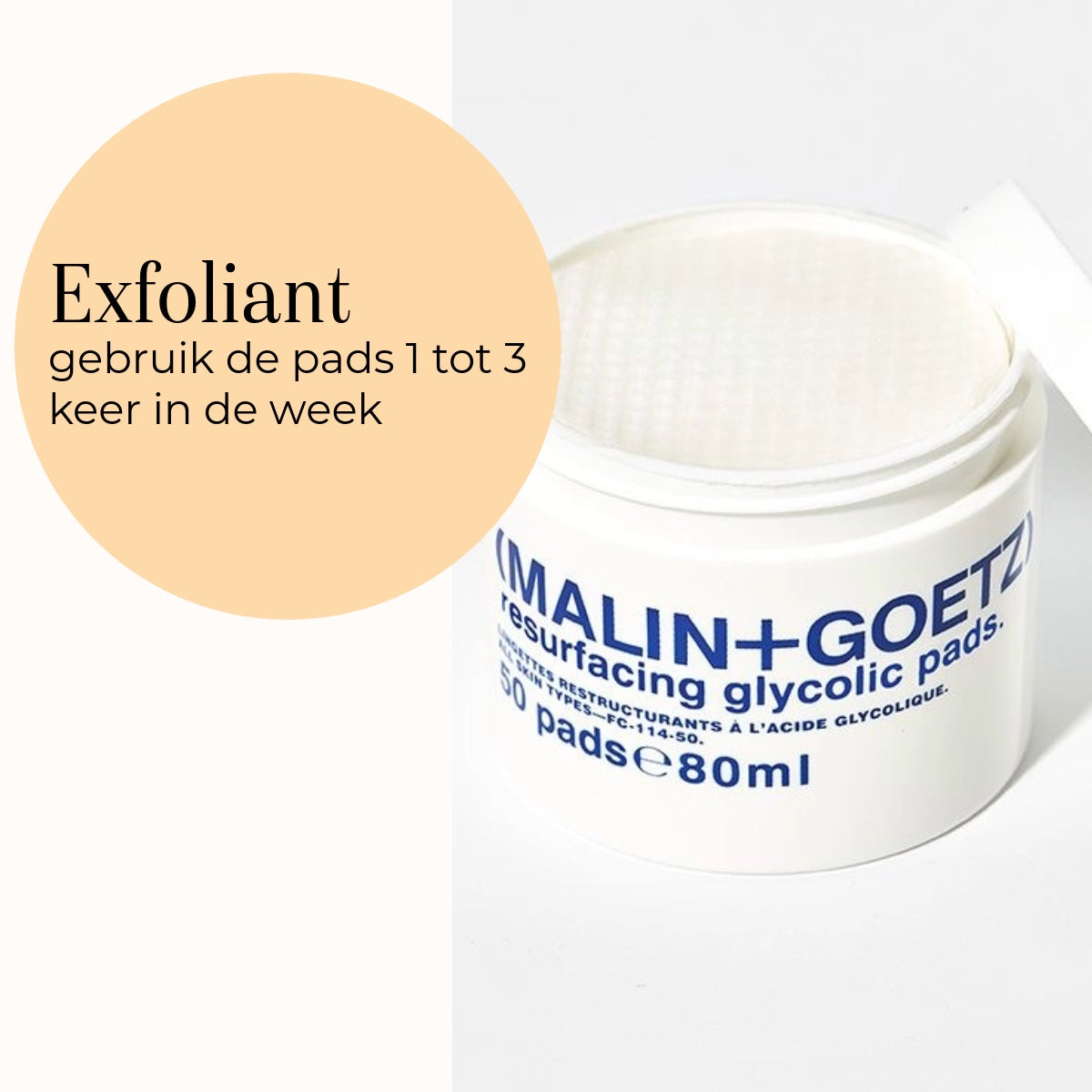 Malin+Goetz Resurfacing Glycolic zijn exfoliërende pads met 10% glycolzuur. Deze kun je inzetten als milde peeling en helpt fijne lijntjes te egaliseren, pigmentatie te verminderen en de textuur te verbeteren.