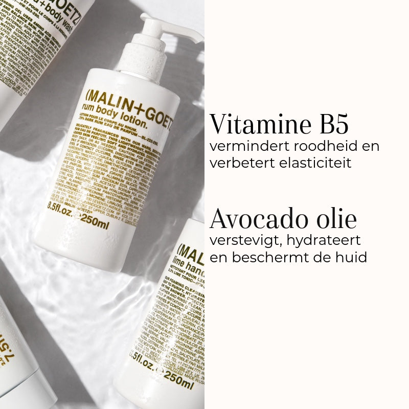Na het douchen met bijvoorbeeld de Malin + Goetz Rum Hand + Body Wash, de lichaamsverzorging aanbrengen op de huid. Vergeet ook niet de okselhuid een frisse geur te geven met de Malin + Goetz Bergamot Deodorant.