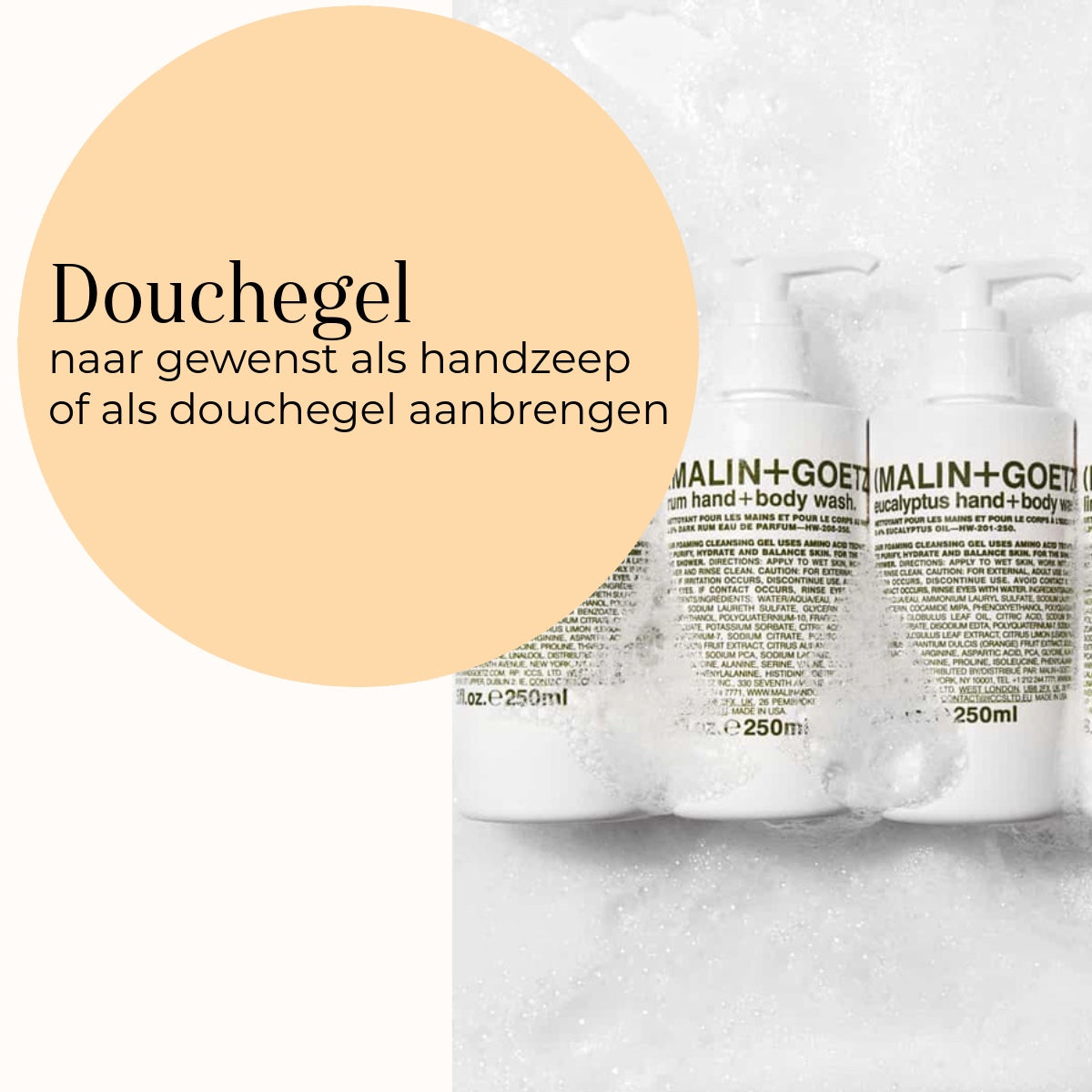 Naar wens te gebruiken, als handzeep zo vaak als je wilt en als douchegel bij voorkeur 1x per dag. Breng na het douchen een body lotion aan, zoals de Malin + Goetz Rum Body Lotion en gebruik de Malin + Goetz Eucalyptus Deodorant om de okselhuid fris te houden en te beschermen tegen nare geurtjes.