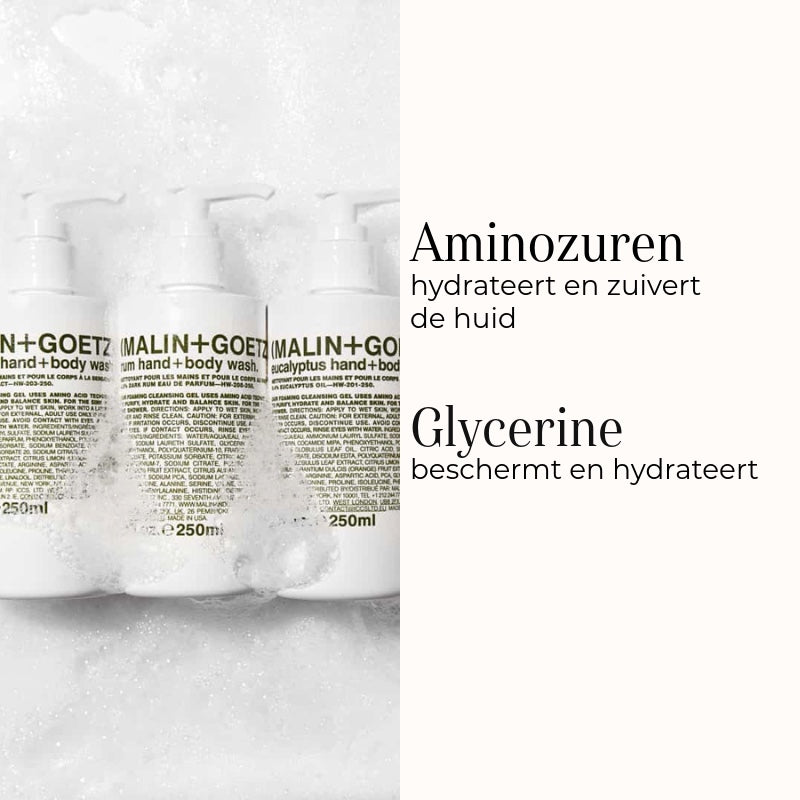 De Malin+Goetz Rum Hand + Body Wash zorgt ervoor dat de huid schoon & gehydrateerd wordt en weer fris aanvoelt zonder uit te drogen.