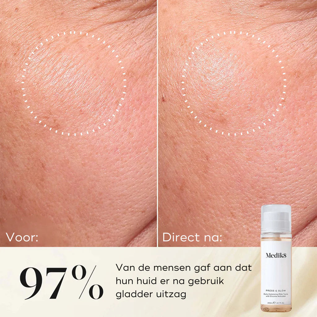De Medik8 Press & Glow helpt de huidbarrière te versterken zonder gevoeligheid te veroorzaken en biedt anti aging en milde exfoliërende voordelen. De toner verwijdert de bovenste dode huidlagen, waardoor de huid een zichtbare heldere, egalere en verzacht uiterlijk krijgt.