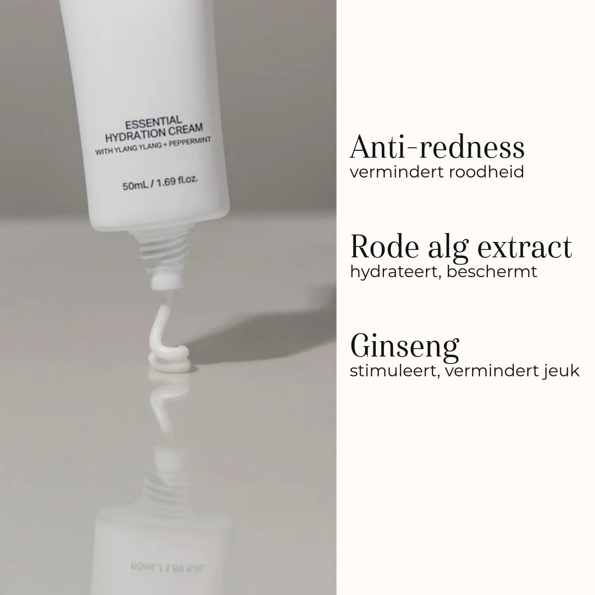 - Rode alg extract: Hydrateert, maakt de huid voller en ondersteunt de barrièrefunctie. Rijk aan antioxidanten die schade door UV-straling tegengaan.