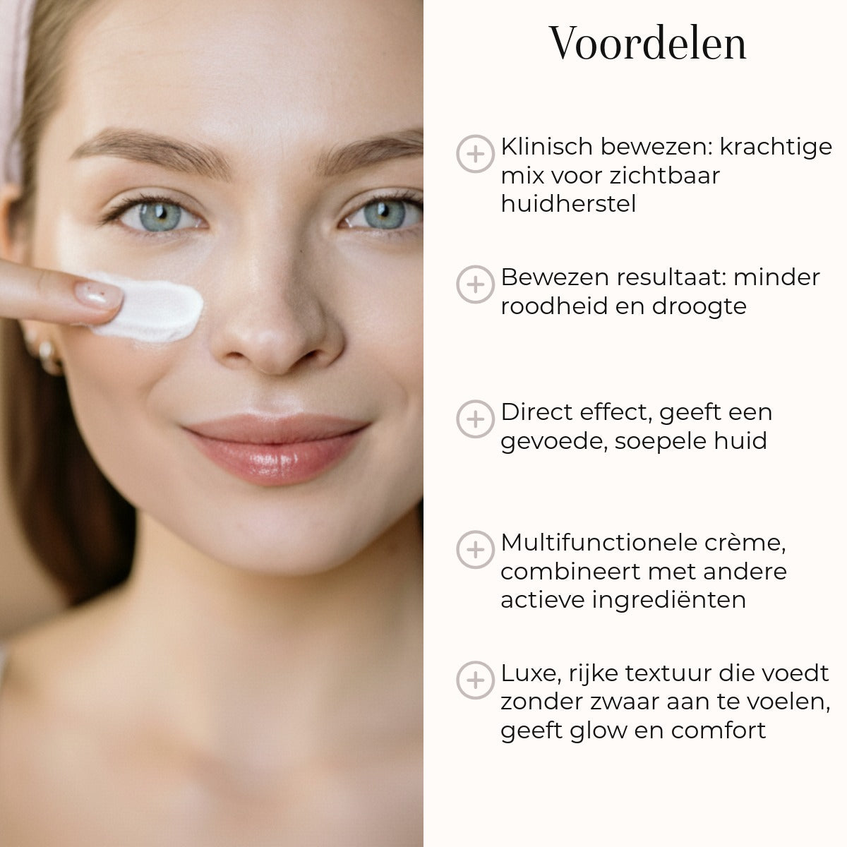 Deze crème zorgt ervoor dat de gevoelige huid weer comfortabel aanvoelt en er rustiger uit ziet. Roodheid, jeuk en irritatie worden aanzienlijk verminderd. Het is rijk aan antioxidanten die de huid beschermen tegen vrije radicalen. Daarnaast wordt de collageen productie gestimuleerd