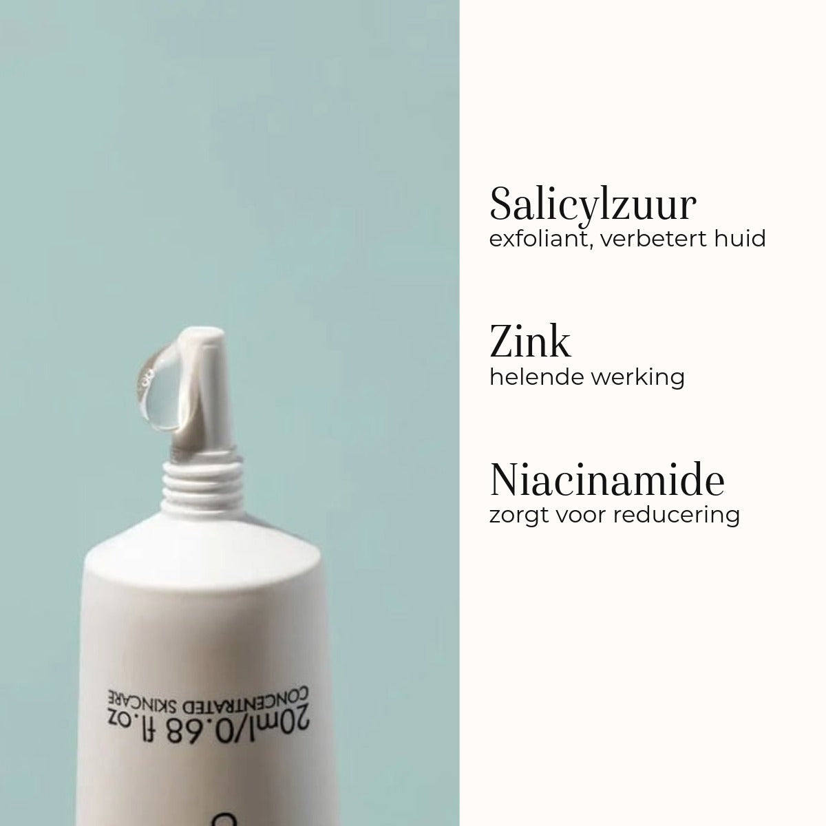 - Niacinamide (vitamine B3) 4%: Zorgt voor sterke reducering van bovenmatige talgproductie en ontstekingen.