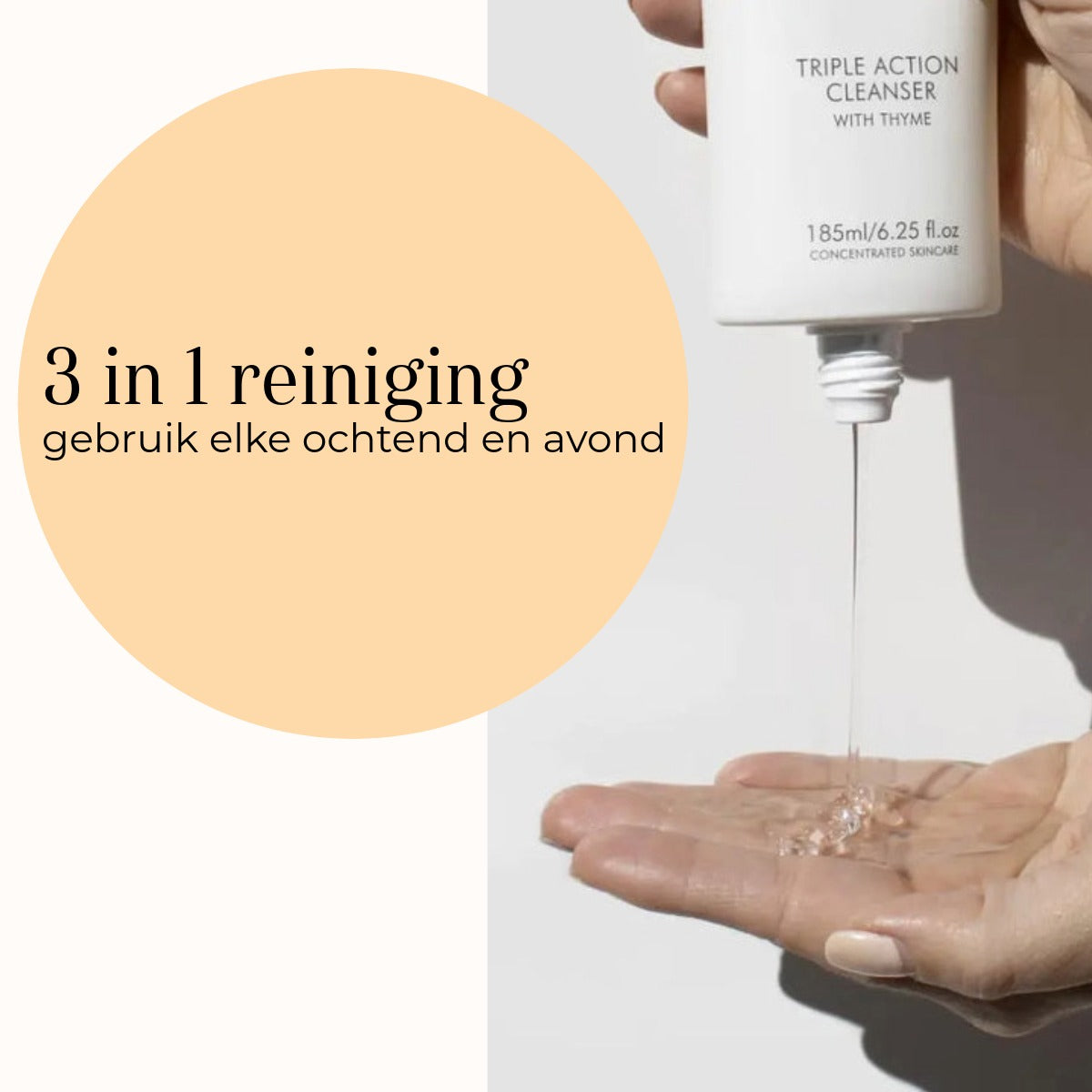De Alpha-H Triple Action Cleanser is een 3 in 1 product. Het is een verfrissende, kalmerende, vegan cleanser, lotion én oogmake-up remover. Ideaal voor de normale, gecombineerde tot vette huid.