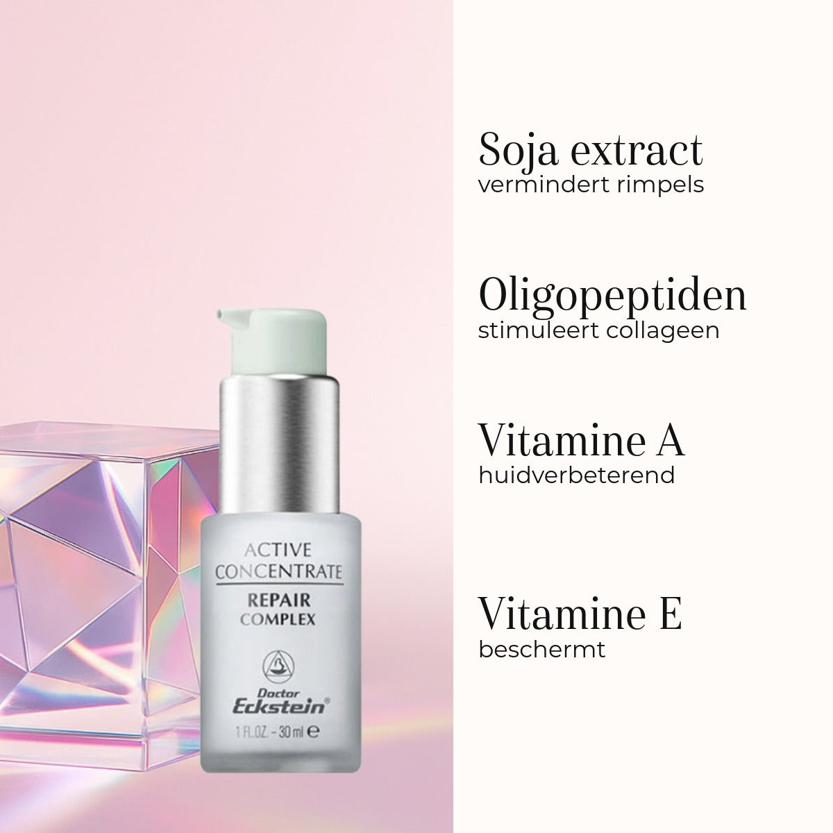 Het Doctor Eckstein Repair Complex is een vochtherstellend en regenererend serum voor de rijpe, zonbeschadigde huid. Het serum zorgt ervoor dat de huid vocht vasthoudt en stimuleert de celvernieuwing.