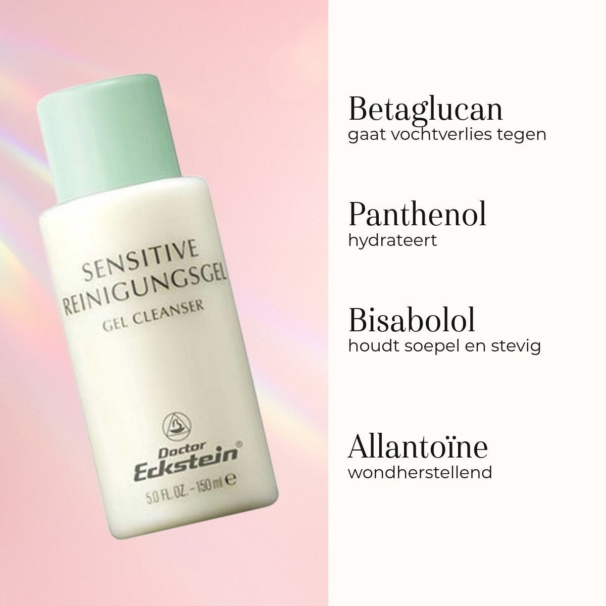 De Doctor Eckstein Sensitive Reinigingsgel geeft de huid een kalmerende reiniging, speciaal voor de gevoelige huid. De huid wordt op een zachte manier gereinigd en ontdaan van huidschilfers, vuil en restjes make-up. De huid wordt gekalmeerd en het natuurlijke evenwicht van de huid wordt hersteld.