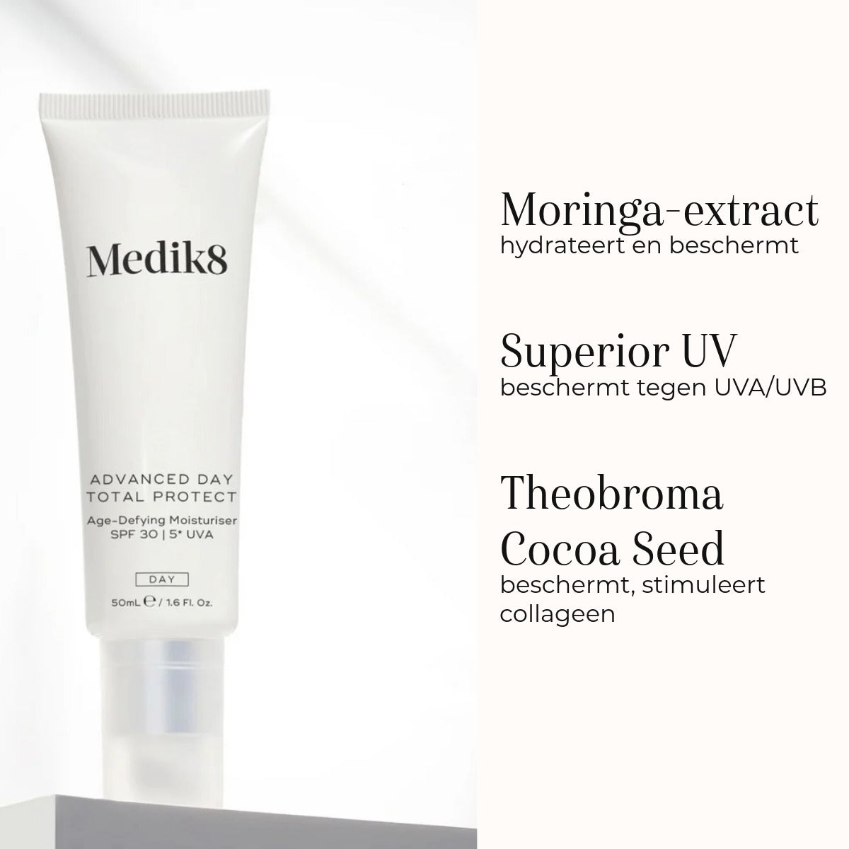 De Medik8 Advanced Day Total Protect - SPF 30 is een krachtige combinatie van ingrediënten die maximale bescherming biedt tegen huidveroudering en pigmentatie, veroorzaakt door de omgeving (denk aan UV-licht, vervuiling en blauw licht).