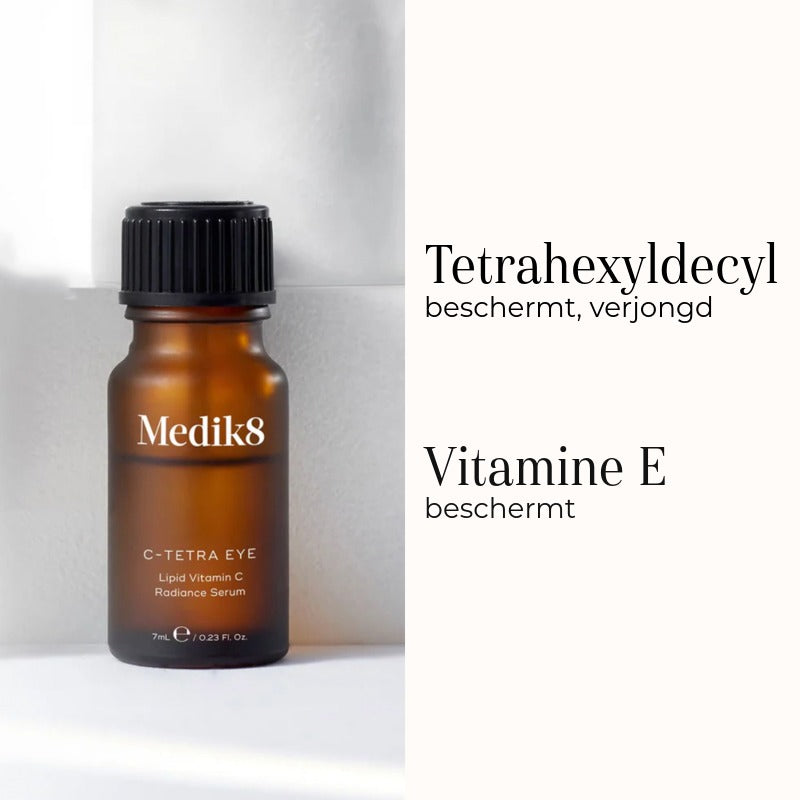 Het Medik8 C-Tetra Eye oogserum vermindert de fijne lijntjes en rimpels rondom de gevoelige ooghuid en beschermt tegen de eerste tekenen van huidveroudering.