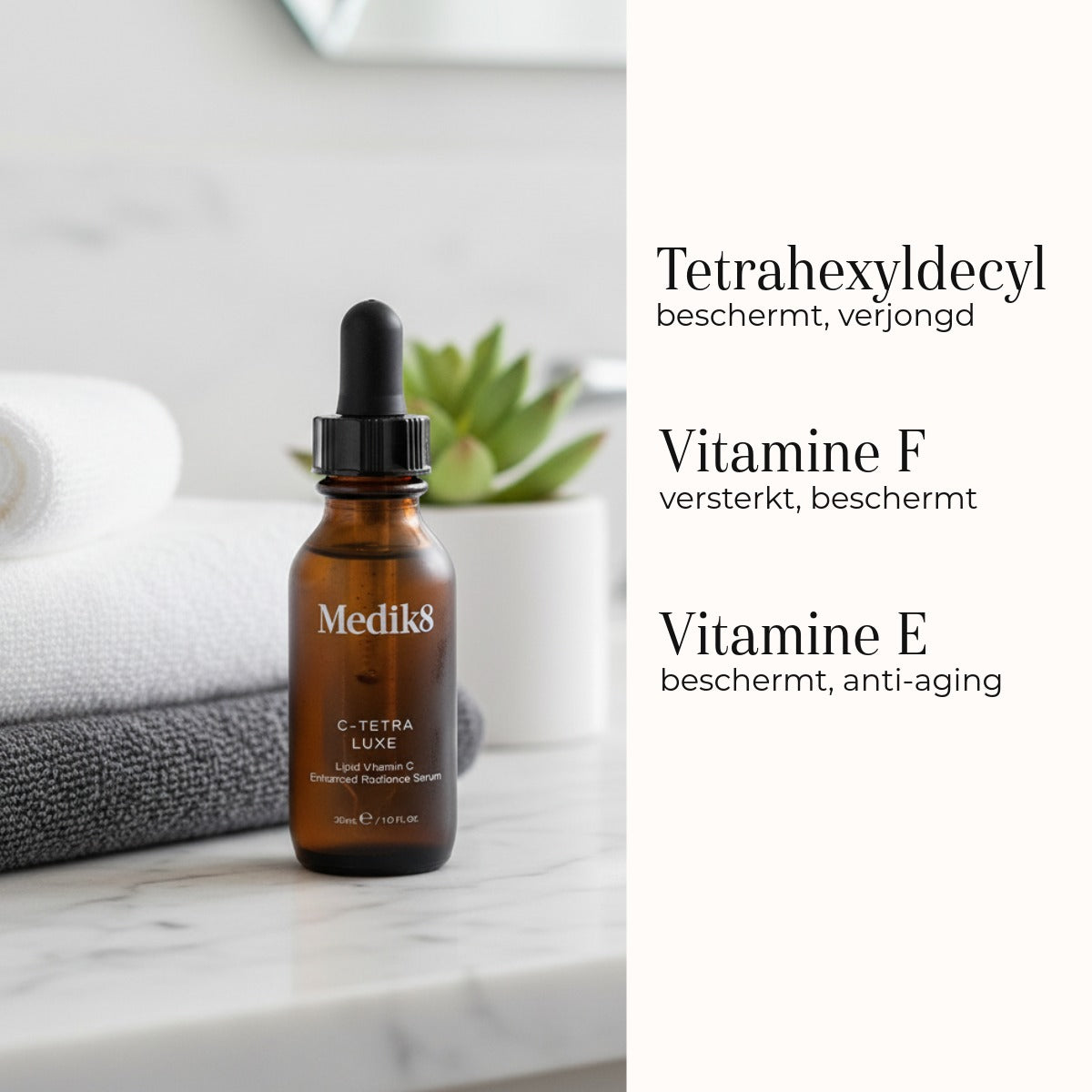 De kracht van het bekende Medik 8 C-Tetra serum, maar met een keer zoveel vitamine C en daardoor een intensievere werking. Vitamine C kan diep in de huid doordringen en de aanmaak van collageen stimuleren. Dat zorgt ervoor dat fijne lijntjes en rimpels worden opgevuld en resulteert in een gladdere huidteint.