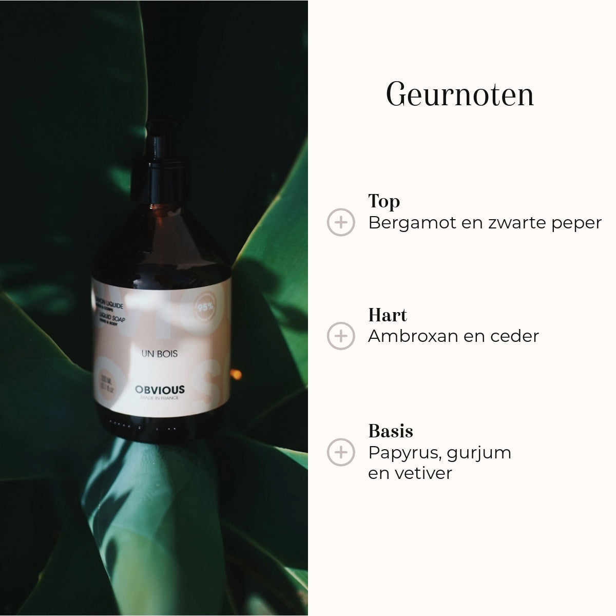 De Obvious Parfums Liquid Soap - Un Bois is een hand- en lichaamszeep met een frisse, stevige en droge geur. Een moderne houtachtige geur. Het is samengesteld uit kwalitatieve plantaardige oliën (kokosolie en olijfolie).