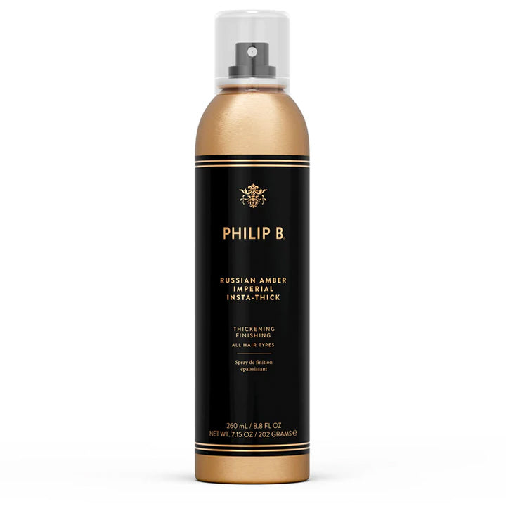 De Philip B Russian Amber Imperial Insta-Thick is een revolutionaire haarverdikkingsspray die futloos haar onmiddellijk transformeert. Verrijkt met extracten van kamille, smeerwortel, rozenbottel en geranium, geeft deze spray direct volume, veerkracht en glans, terwijl het haar zacht aanvoelt. Zelfs de meest fijne of futloze haarbos krijgt langdurige body, en uitwassen gaat eenvoudig.
