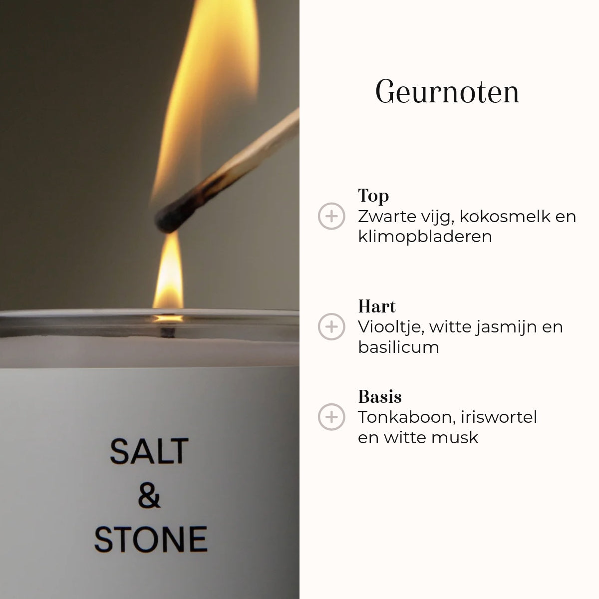 Deze Salt & Stone Geurkaars vult de ruimte met een heerlijke geur van vijg en viooltje. Deze geurkaars is gemaakt op basis van kokosnoot- en sojawas en heeft een brandtijd van maar liefst 50 uur. Dit huisparfum is geformuleerd met veganistische ingrediënten.