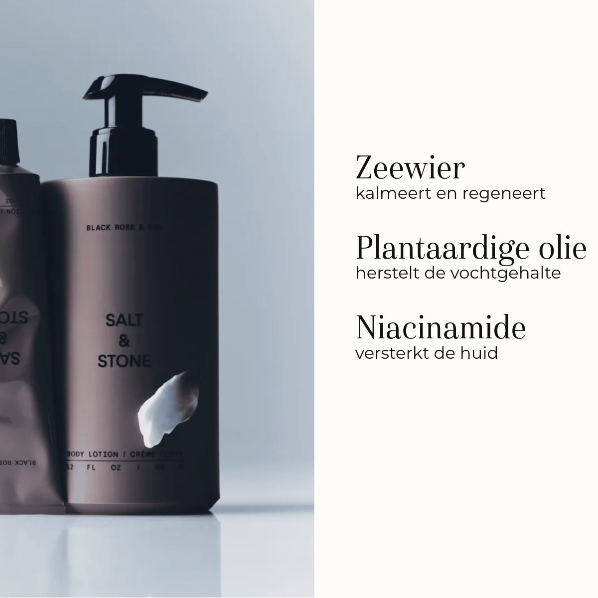 Salt & Stone Body Lotion Black Rose & Oud is een snel absorberende bodylotion doordrenkt met zeewierextracten en niacinamde. Het voedt en hydrateert de huid en laat de huid zijdezacht aanvoelen. Met de geur van zwarte rozen en lelies, verfrissend en toch sensueel. Met tonen van diepe, warme oudh in combinatie met frisse vetiver.