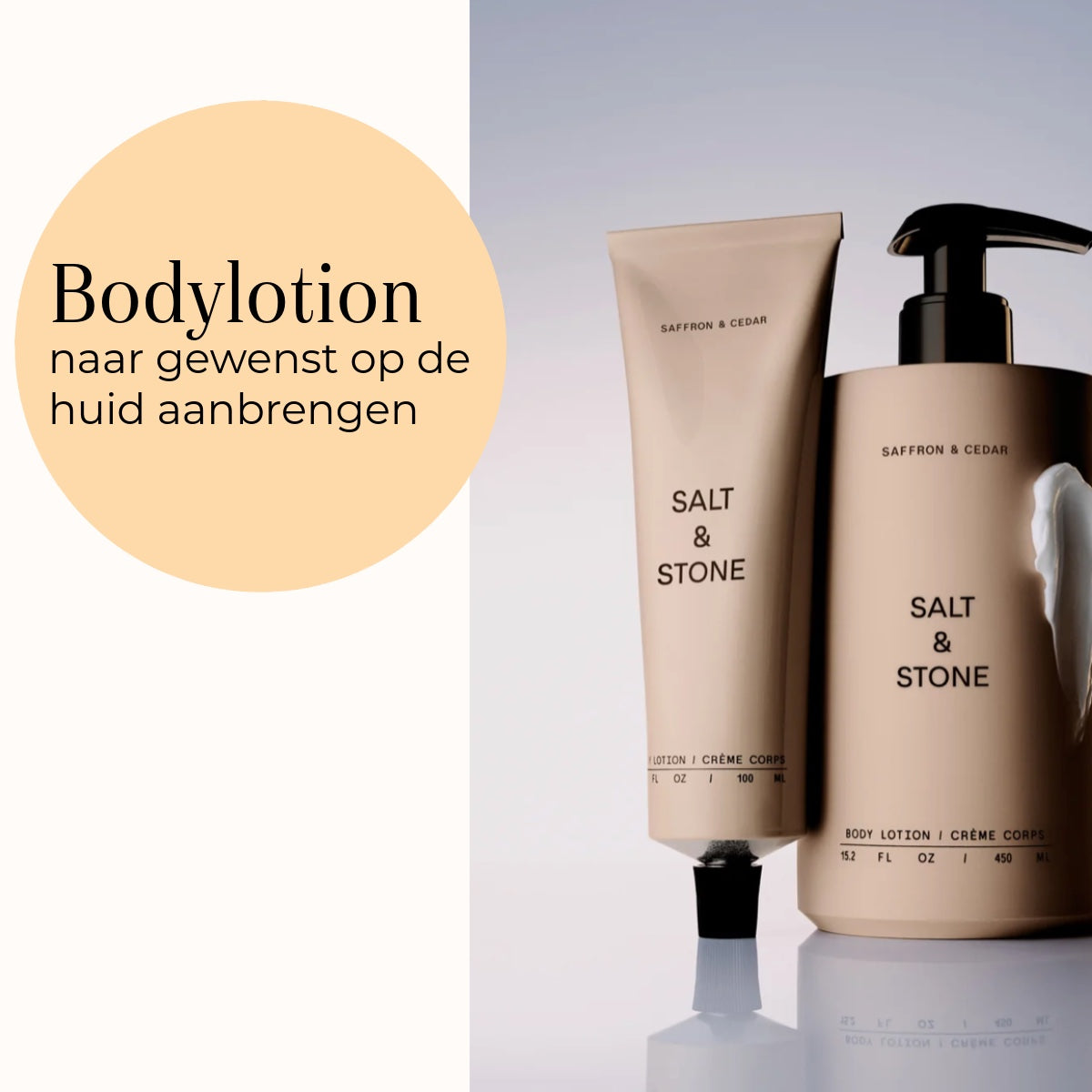 Salt & Stone Body Lotion Saffron & Cedar is een snel absorberende bodylotion doordrenkt met zeewierextracten en niacinamide. Het voedt en hydrateert de huid en laat de huid zijdezacht aanvoelen. Met de geur van saffraan en cederhout, als frisse regen op warme grond.