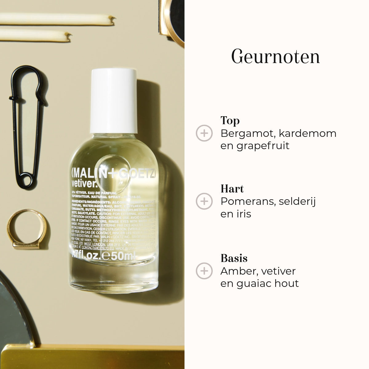 De Malin+Goetz Eau de Parfum Vetiver. Helder als de ochtenddauw, vers als pas gemaaid gras en fris als citrusschillen. De aromatische vetiver krijgt een aardse en heldere aroma door warme noten van selderij zaad, amber en guaiac hout. De dynamische schoonheid van moeder Aarde in een flesje.