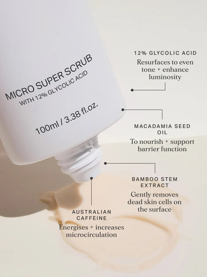 De Alpha-H Micro Super Scrub werkt als microdermabrasie in een tube. Het is een zeer fijne scrub en peeling in één. Het bevat 12% glycolzuur en biologisch afbreekbare scrubdeeltjes van bamboe extract dat dode huidcellen verwijdert, de doorbloeding stimuleert en de huid er fris en egaal uit laat zien.