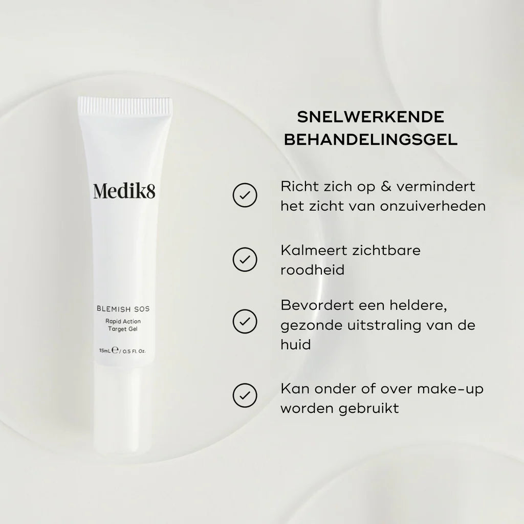 De Medik8 Blemish SOS vermindert zichtbaar puistjes in slechts een paar uur. Deze sneldrogende gel bevat salicylzuur en verzachtende niacinamide. Het acne serum kalmeert acneplekjes, terwijl het onzichtbaar blijft op de huid.