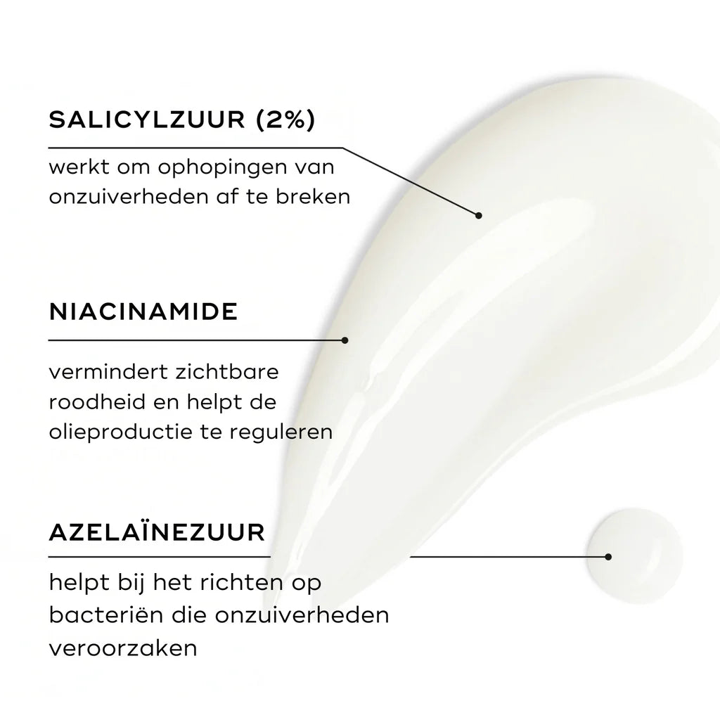 - Salicylzuur (BHA): Zorgt voor een diepe reiniging van de poriën en verwijdert overtollig talg en vuil. Het remt de ontstekingen.