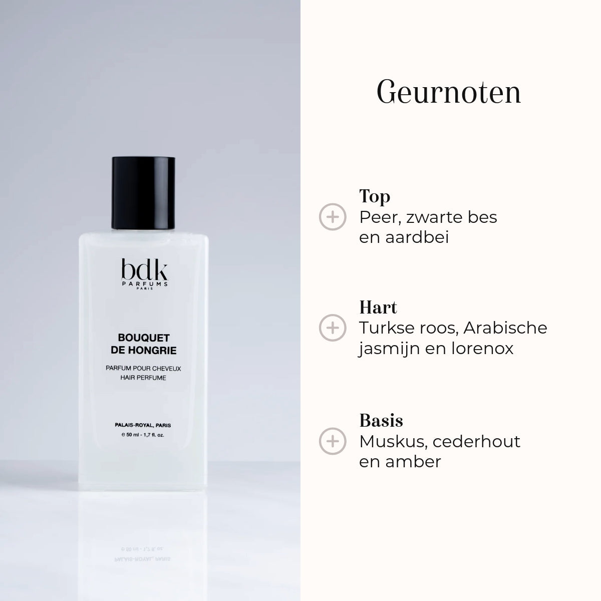 Het BDK Parfums Hair Perfume - Bouquet de Hongrie heeft een bloemige, groene en muskachtige geur geïnspireerd door de lente in de tuinen van het Palais-Royal. Het haarparfum bevat verzorgende ingrediënten die hydrateren, de elasticiteit verbeteren en de haren zijdezacht maken.