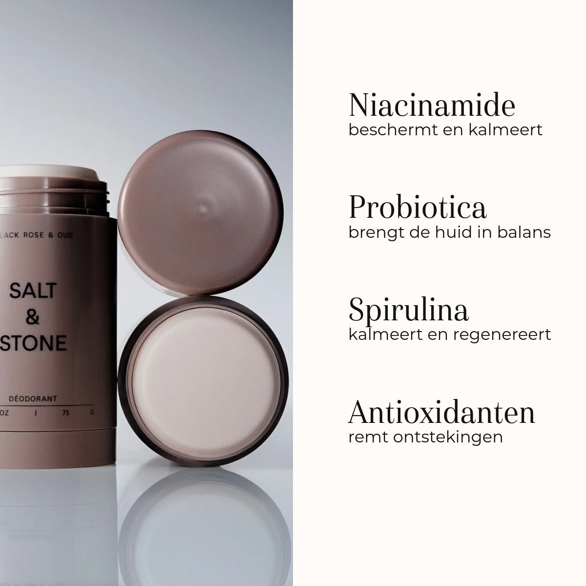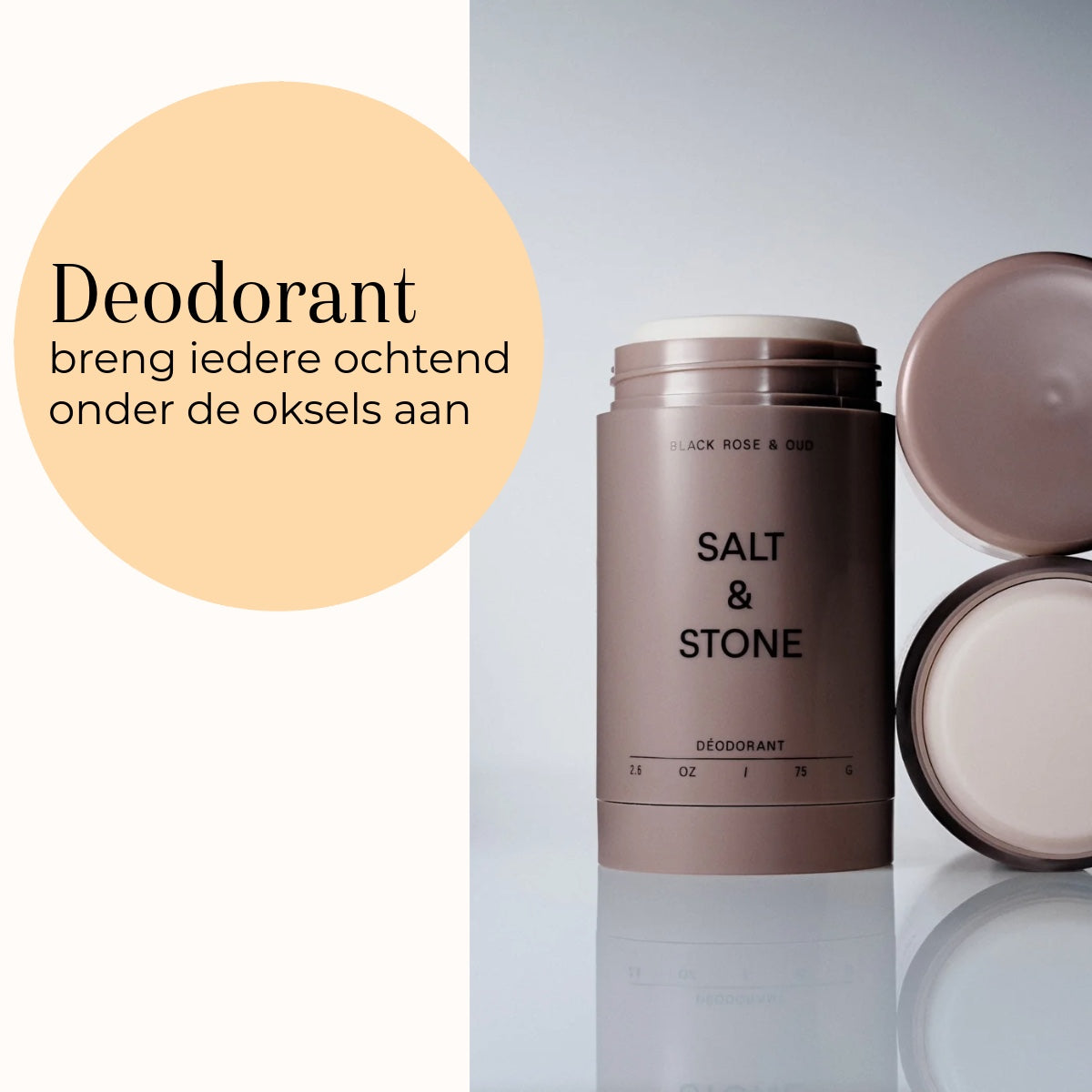 Salt & Stone Deodorant Black Rose & Oud is een extra sterke natuurlijke deodorant die zo geformuleerd is dat hij 24 uur lang bescherming biedt. Met topnoten van zwarte roos en lelietjes van dalen die zorgen voor een bloemige, licht zoete geur.